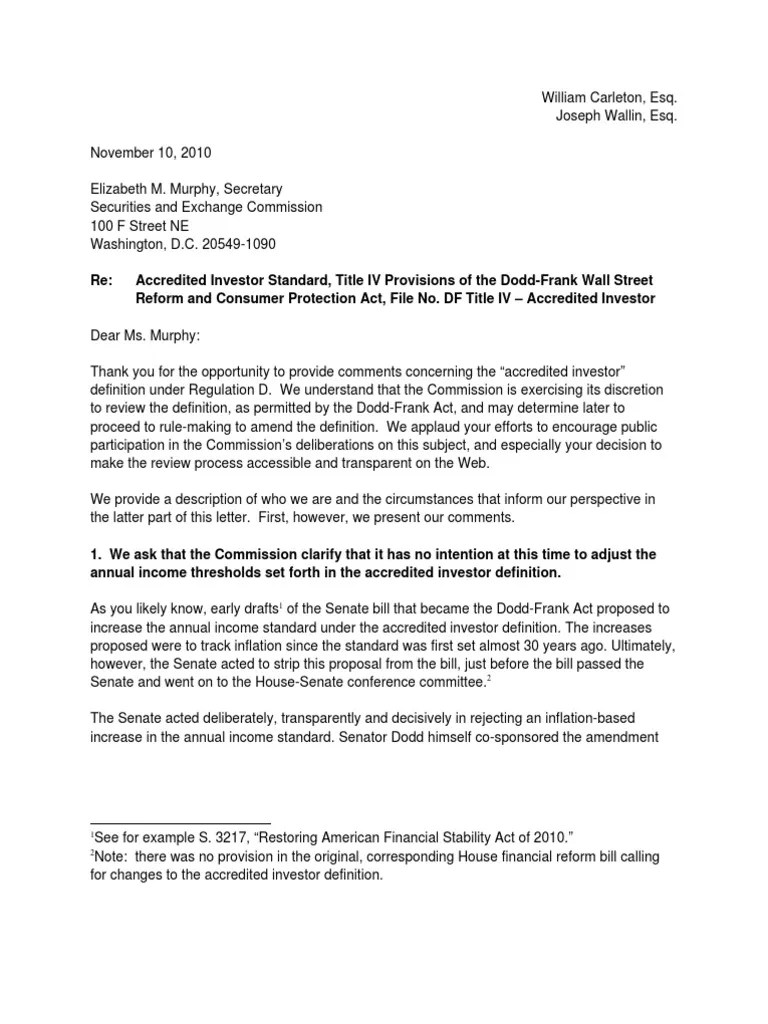 Letter From Carleton and Wallin Re Accredited Investor Definition