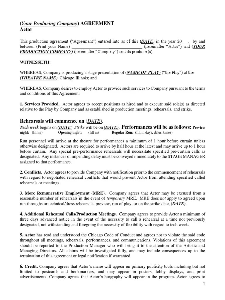 Whenever actors are hired by legitimate production companies, they need to sign a contract. Our second post covers basics of a film production agreement and the third post covers basics of a film distribution agreement. Get your fillable template and complete it online using the instructions provided. Web this actor employment agreement is between a producer and an actor who will appear in a motion picture.