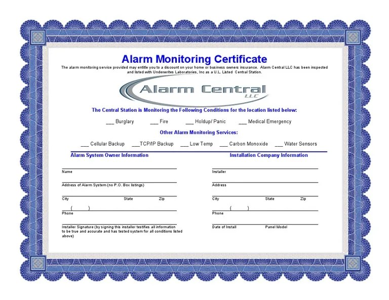 Web how can i obtain an alarm monitoring certificate? You can also download it, export it or print it out. Web how to fill out and sign alarm certificate for insurance template online? Other documents available the following certificates may also. Web to obtain a certificate of monitoring, go to account > account documents > insurance discount as shown below.