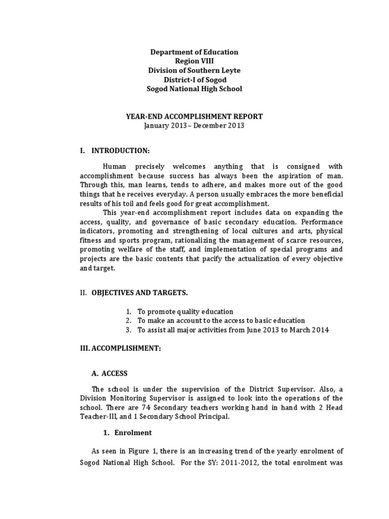 This event takes place annually on national public lands day. The important part is to. Division education development plan(dedp) research; Keep reading for our 55+ top annual report templates and examples. Web an employee accomplishment report is a document that records all accomplishments that have been made by the employee. Ad no matter your mission, get the right reporting creation tools to accomplish it. Web included on this page, you'll find a variety of free, helpful templates, including a simple year end report template, an annual financial report template,. Web if you need a template for work, browse through our different business reports, from monthly to annual reports or project status or social media reports. Download template on year end accomplishment. Annual update and accomplishment report download now; Quantitative statements measure your accomplishments using concrete. Learn whereby in create effective project progress information. Web all it takes is the right report maker tools — and the right annual report design templates. Design to highlight big numbers and wins for the year using our. If you're looking for an annual report design that highlights your brand's fun. Easily find the reporting creation tools you're looking for w/ our comparison grid. The concepcion pequeña national high school is . Web consider setting up a consistent cadence, like daily, weekly, monthly, quarterly or annually—whatever best matches your needs. Some common types of annual accomplishment reports are annual. These 60 best indesign annual report templates are easy on the eyes (and easy to edit).