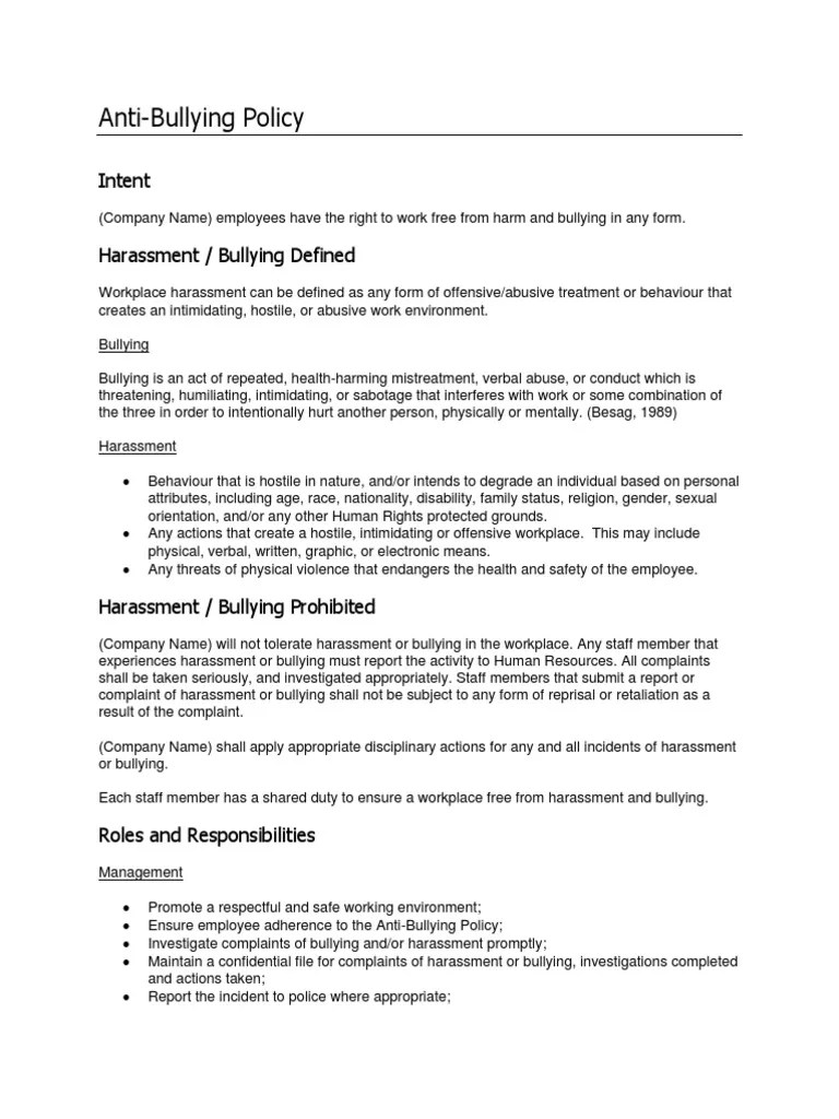 It covers the key topics. Web this free australian workplace harassment and bullying policy will outline your organisation’s expectations around employee conduct, along with the roles and. During work activities, for example, when dealing with. Web this policy applies to behaviours that occur: Anti bullying policy and procedure template 4.