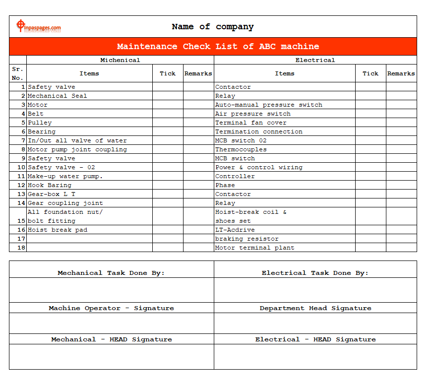 Electrical Checklist In Excel Format Equipment Maintenance Checklist