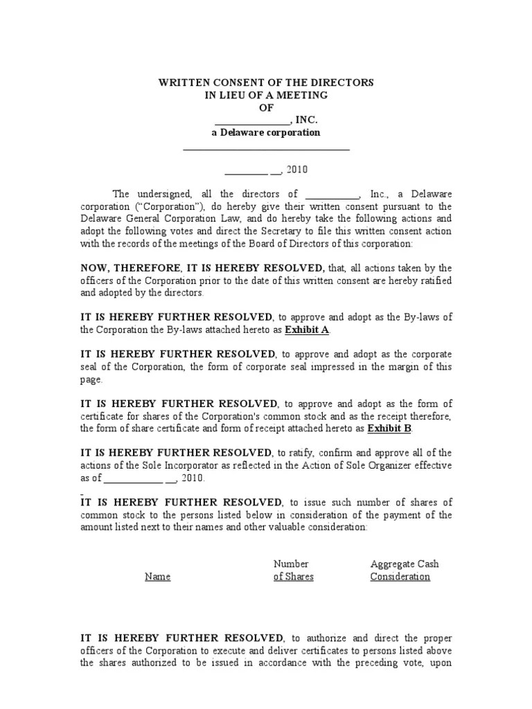 Web in accordance with section 141(f) of the delaware general corporation law and the bylaws of [company name], a delaware corporation (the “company”), the undersigned,. Stay compliant with corporate formalities. Rocketlawyer.com has been visited by 100k+ users in the past month These resolutions are drafted as standard clauses to be.