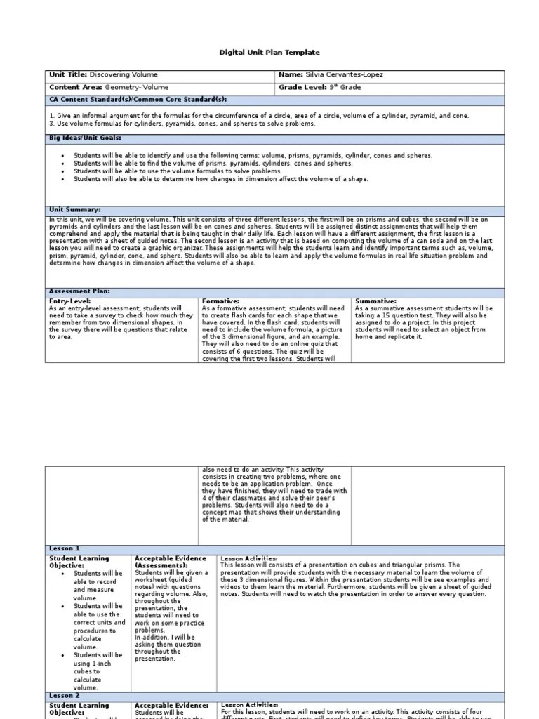 Digital Unit Plan Template Unit Title Discovering Volume Name Silvia