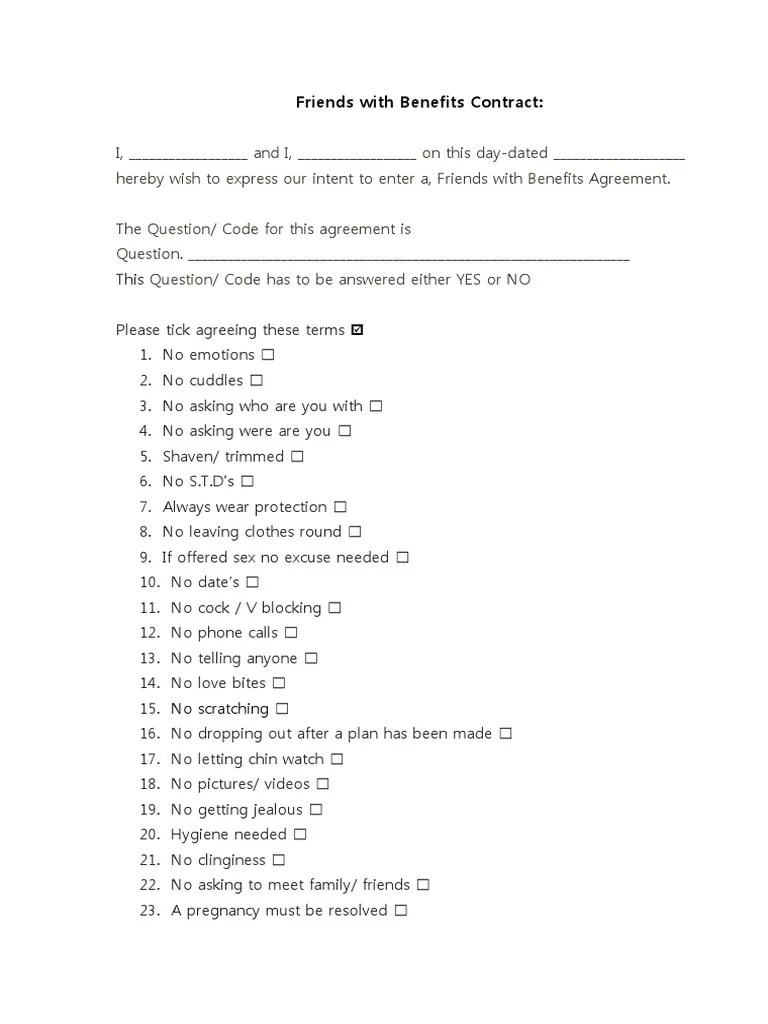 Edit your friends with benefits application form pdf online type text, add images,. The main purpose of the contract is for the equal satisfaction of urges,. Web friends with benefits contract. No asking to meet family/ friends ☐ 23.