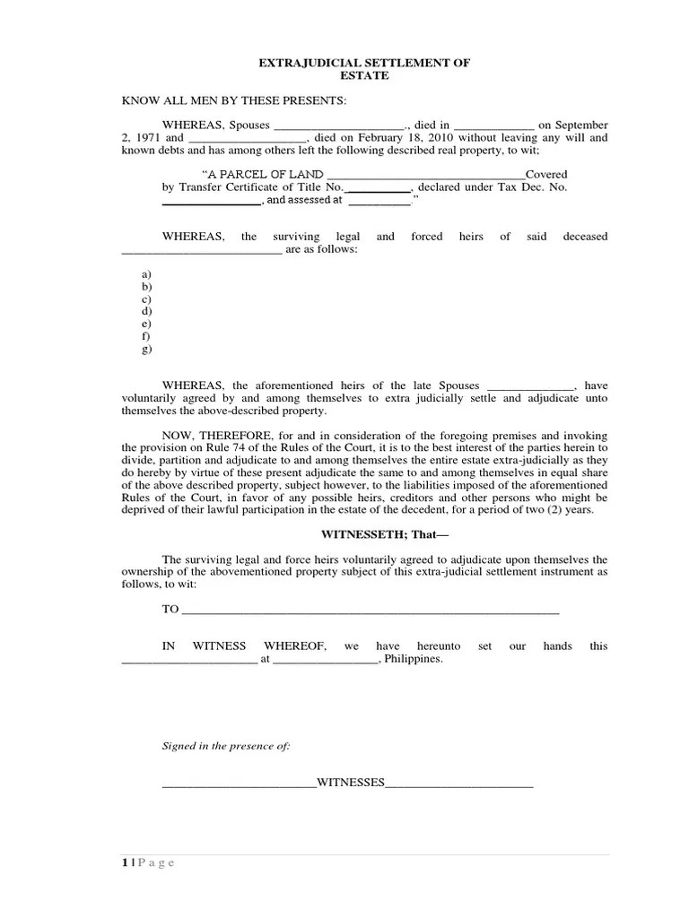 Extrajudicial Settlement of Estate Sample Inheritance Property
