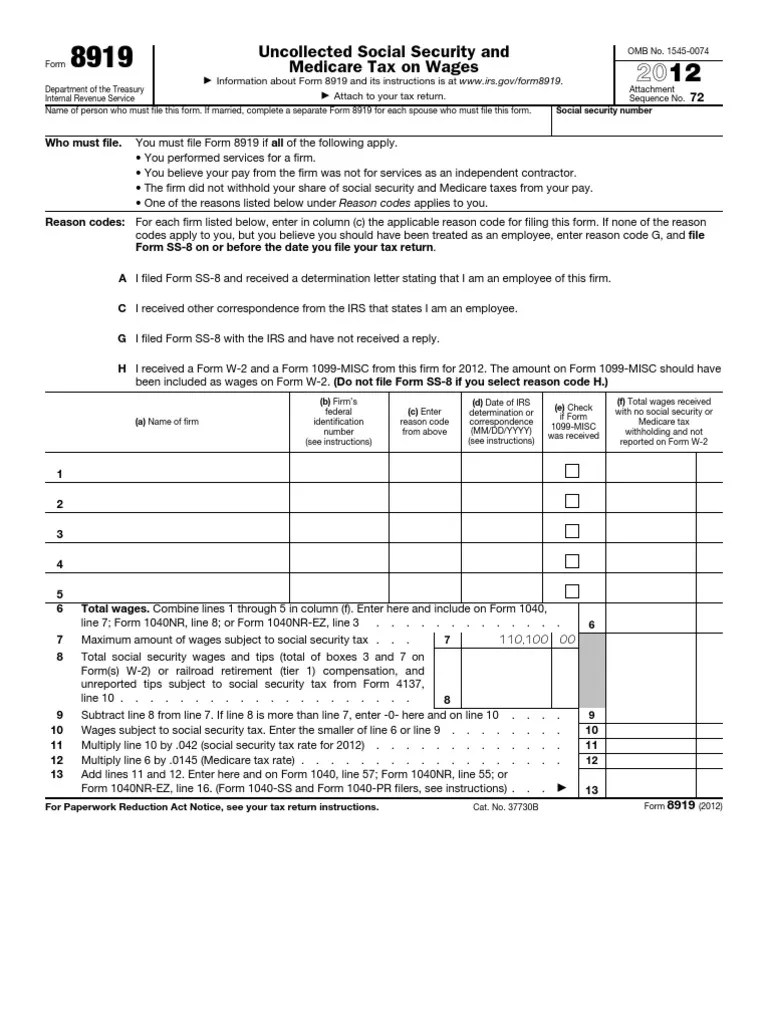IRS Publication Form 8919 Irs Tax Forms Social Security (United States)
