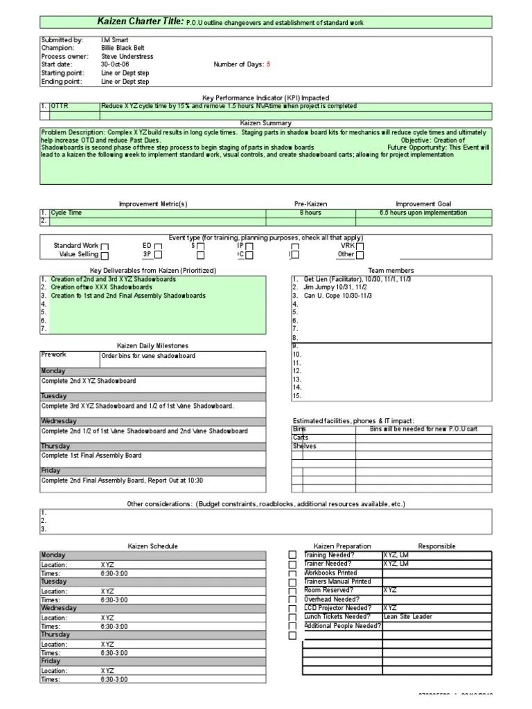 Web the kaizen leader is empowered by this kaizen event charter to proceed with the. Web may 7, 2019 12:30:15 pm while we are huge fans of standardization and. The next section of your template should lay out the charter for. Web a kaizen event is a discrete continuous improvement project with a defined start and end. Web 728 east.