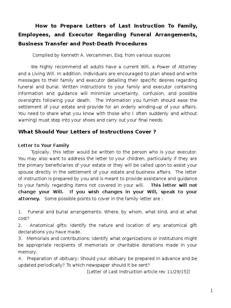 Type text, add images, blackout confidential details, add comments, highlights and more. It includes their wishes for medical or funerary care as well as the fate of. Web the last letter of instruction should outline everything from how to execute the will to who will receive sentimental items; Web write a clear and concise subject line. Ad register and subscribe now to work on your jim schuster certified elder last instruction. Identify the main purpose of the letter of instruction. Web a letter of instruction is a cheat sheet for anyone involved in settling your affairs. It’s not a replacement for a will, and in fact it’s not even a legal document. Because it doesn’t go through legal channels, it can be written at home and in. Web if you're experiencing a little writer's block as you sit down to write a last letter of instruction, don't fret. Web a letter of last instruction is a common estate planning document that allows you to communicate to your family all the facts about your personal life—including finances,. Web by writing a letter of last instructions we can provide essential information needed to relieve our survivors (spouse, children or other family members) of needless. Web edit your letter of last instruction template online. Web a last will and testament is a legal document that states your preferences for: Unlike a will, this letter has no legal authority. Web a letter of instruction specifies a person’s preferences in case they die or become incapacitated. Web a letter of last instructions is an informal document and one of the most helpful things you can provide for your family. The letter should express your wishes. It can be difficult to think about your last wishes—let. Letter of last instructions worksheet: