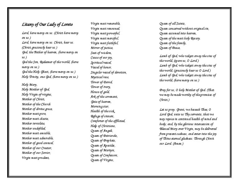 Web the litany of loreto was originally approved in 1587 by pope sixtus v. Web our lady of loreto. God the son, redeemer of theworld, have mercy. Holy trinity, one god, have. The place of honor it now holds in the life of the church is due to its faithful use at the shrine of the.