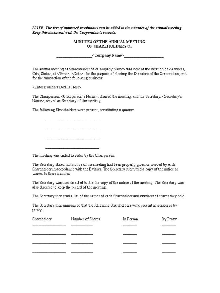 Annual Shareholder Meeting Minutes Template For Your Needs