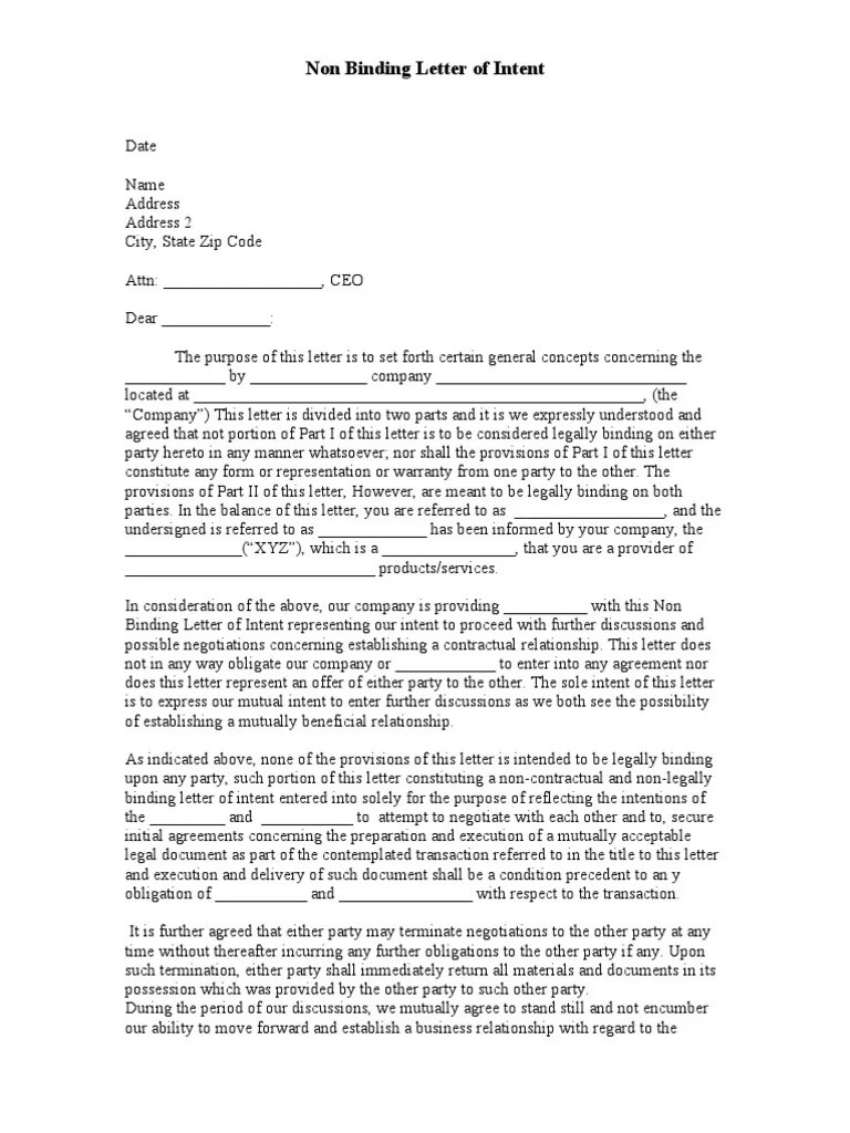 Non Binding Loi Template - Web the definitive agreement can be governed by delaware, but the loi should not be, given the holding in siga technologies. In other words, the loi does. Ad 1) fill fields 2) preview letter of intent 3) print now! There can either be one or multiple owners. Web letter of intent (loi) templates (13) fill now click to fill, edit and sign this form now! Web the initial terms of the agreement. Download and print your free letter of intent today. Rocketlawyer.com has been visited by 100k+ users in the past month Web a letter of intent (loi) is a document that lists the terms of a preliminary commitment between two or more parties that desire to engage in business. However, just because letters of intent are non.