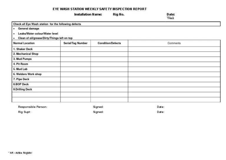 Try it for free now! Web to test the eyewash station, flush water until clear water flows continually through eyewash head without any leaks, rust, dirt, etc. The safety station washes both eyes simultaneously. Web weekly emergency eyewash station inspection template. Use our template to conduct your.