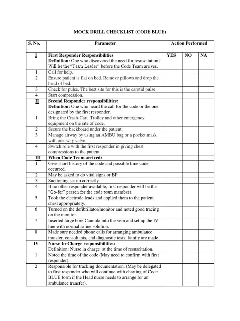 The objective of the mock code blue drill is to evaluate staff competency in the management of cardiac/respiratory arrest or medical emergency in which additional staff. Team leader, md • physician in charge • directs activities of the code • should be positioned at the foot of the bed 2. A mock code competency checklist is an essential tool for healthcare professionals who may be required to participate in emergency code. Web video instructions and help with filling out and completing mock code blue checklist form.