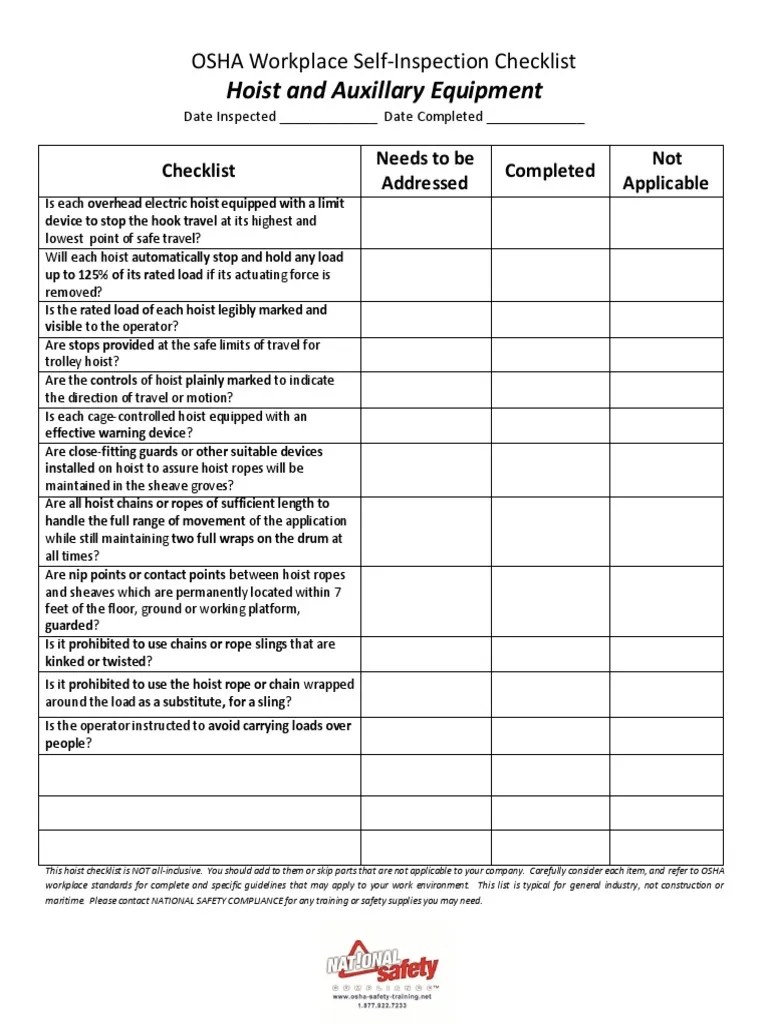 Hoist and Auxillary Equipment OSHA Workplace SelfInspection Checklist