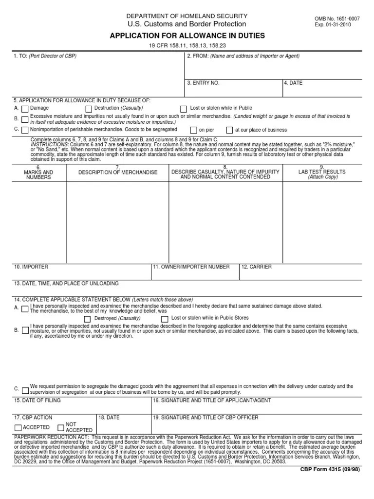 U.S. Customs Form CBP Form 4315 Application For Allowance in Duties