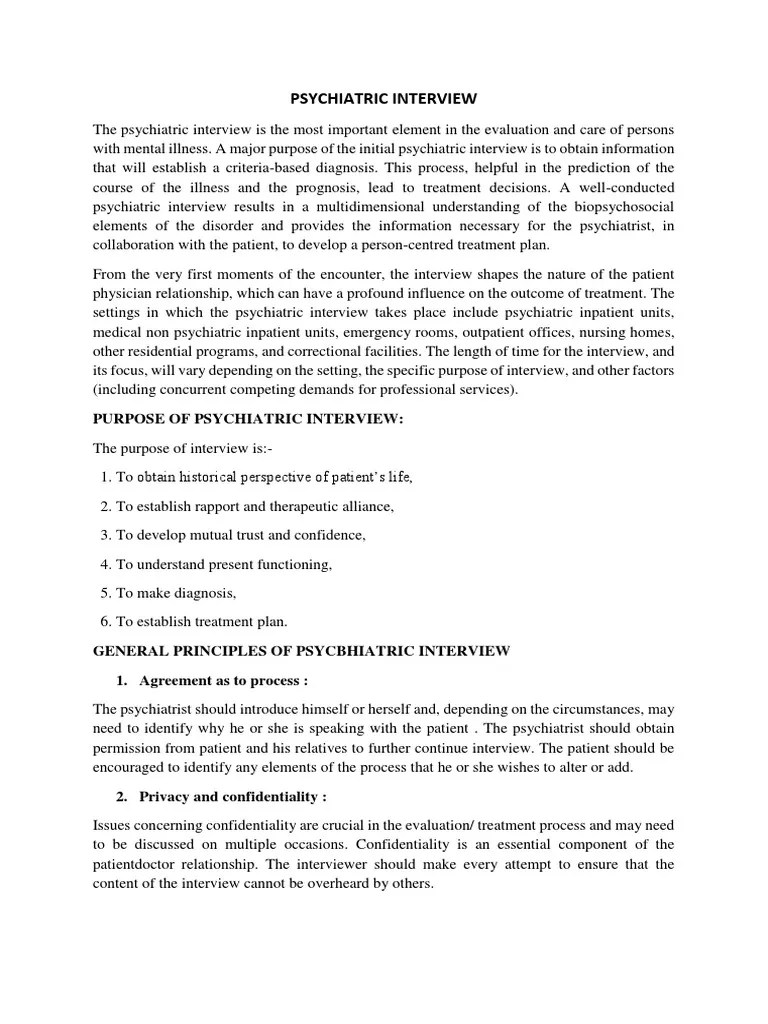 Web psychiatric interview the purpose of a psychiatric interview is to establish a therapeutic relationship with the patient to collect, organize and formulate a differential diagnosis and. Web 2:48 whether you are preparing to interview a candidate or applying for a job, review our list of top psychiatrist interview questions and answers. As a psychiatrist, how would. Web general interviewing approaches to psychiatric symptoms psychiatric symptoms are often difficult for patients to discuss.