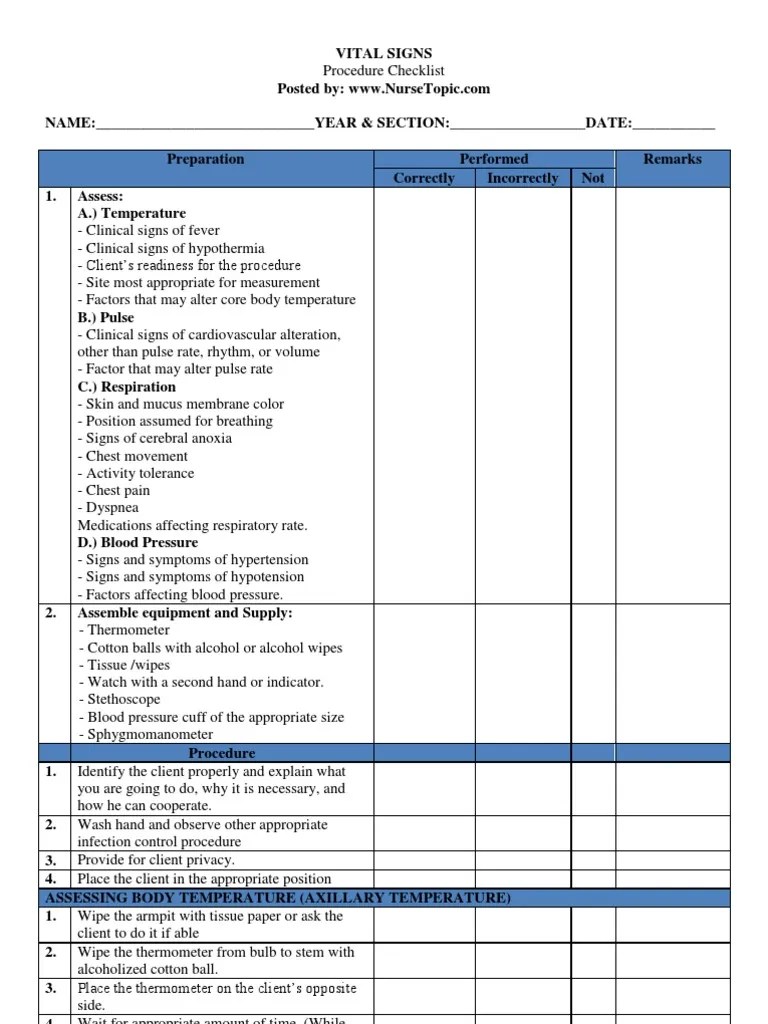 Vital Signs Procedures Checklist Pulse Cardiovascular System