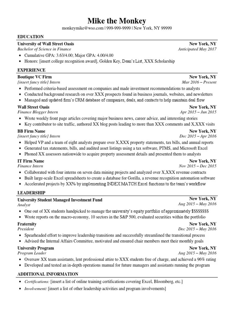 Ssssasa zev ehrlich 123 washington st. Web attached to the bottom of this post, you will find the wall street oasis investment banking resume template for undergraduate students, used by the wso. Web august 21, 2021 ·. Showcase your potential to recruiters and stand out from other candidates with a professional template.